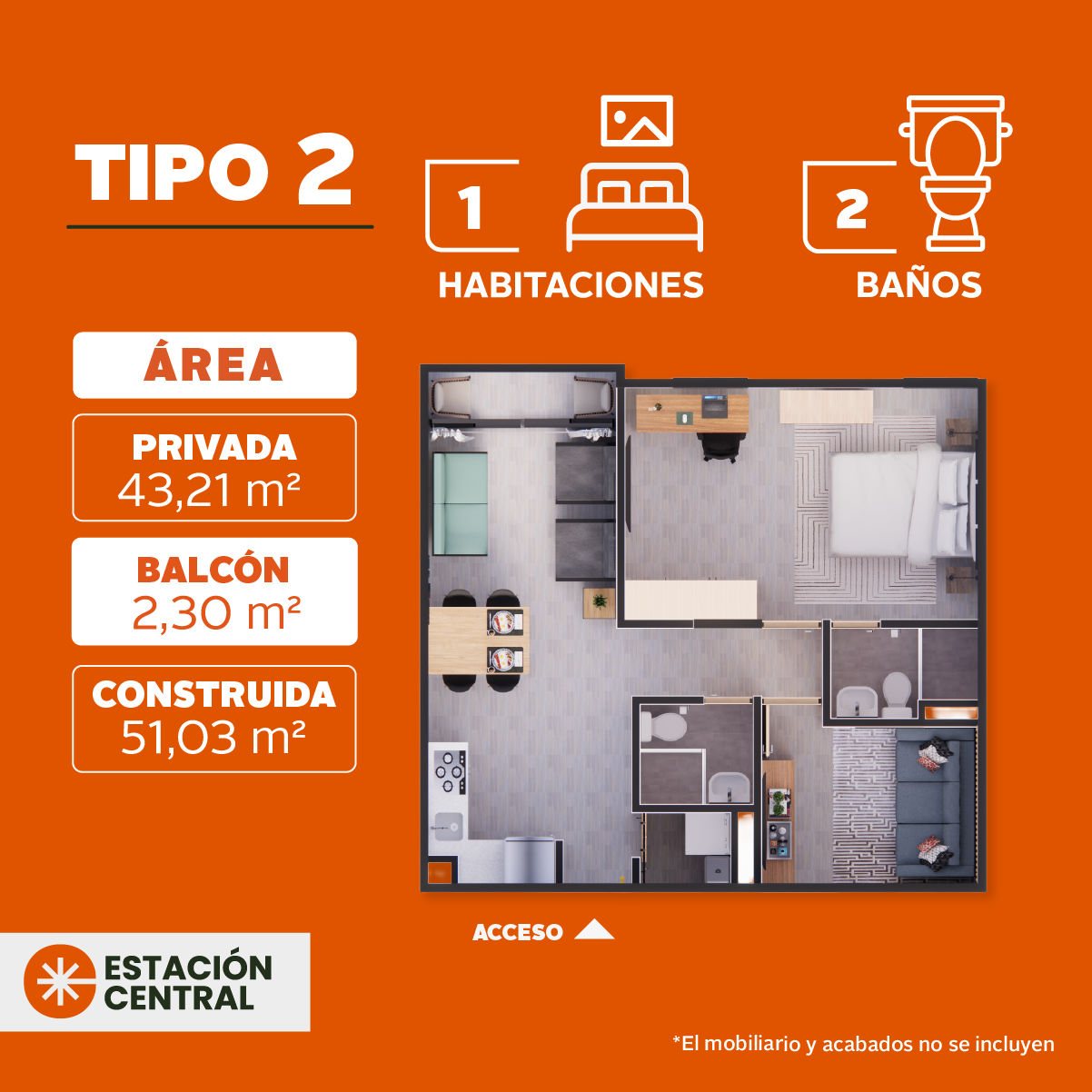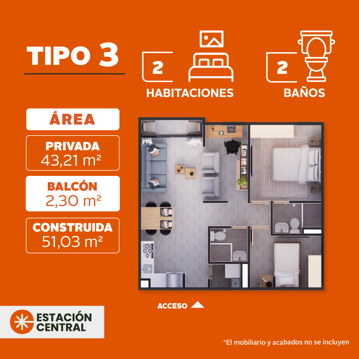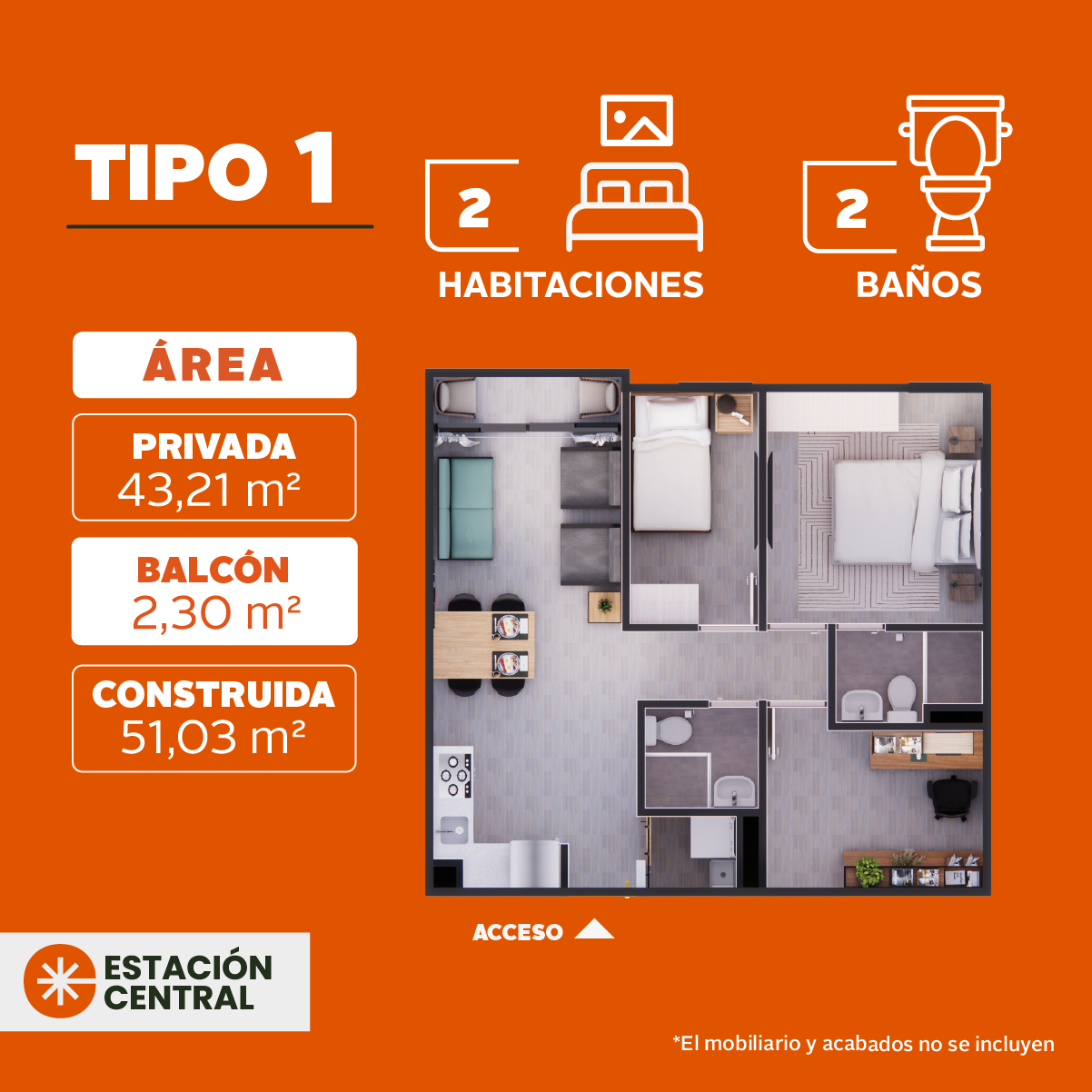 Conformado por 4 torres y un total de 744 apartamentos, Estación Central ofrece diferentes tipos de distribución (2 o 3 habitaciones) y paquetes de acabados flexibles, desde obra gris hasta acabados completos, para que personalices tu hogar de acuerdo con tus necesidades y presupuesto. Además, podrás disfrutar de amenidades como piscina, salón social, gimnasio, zona BBQ, pequelandia, parque infantil y cancha múltiple, en un entorno seguro y familiar.